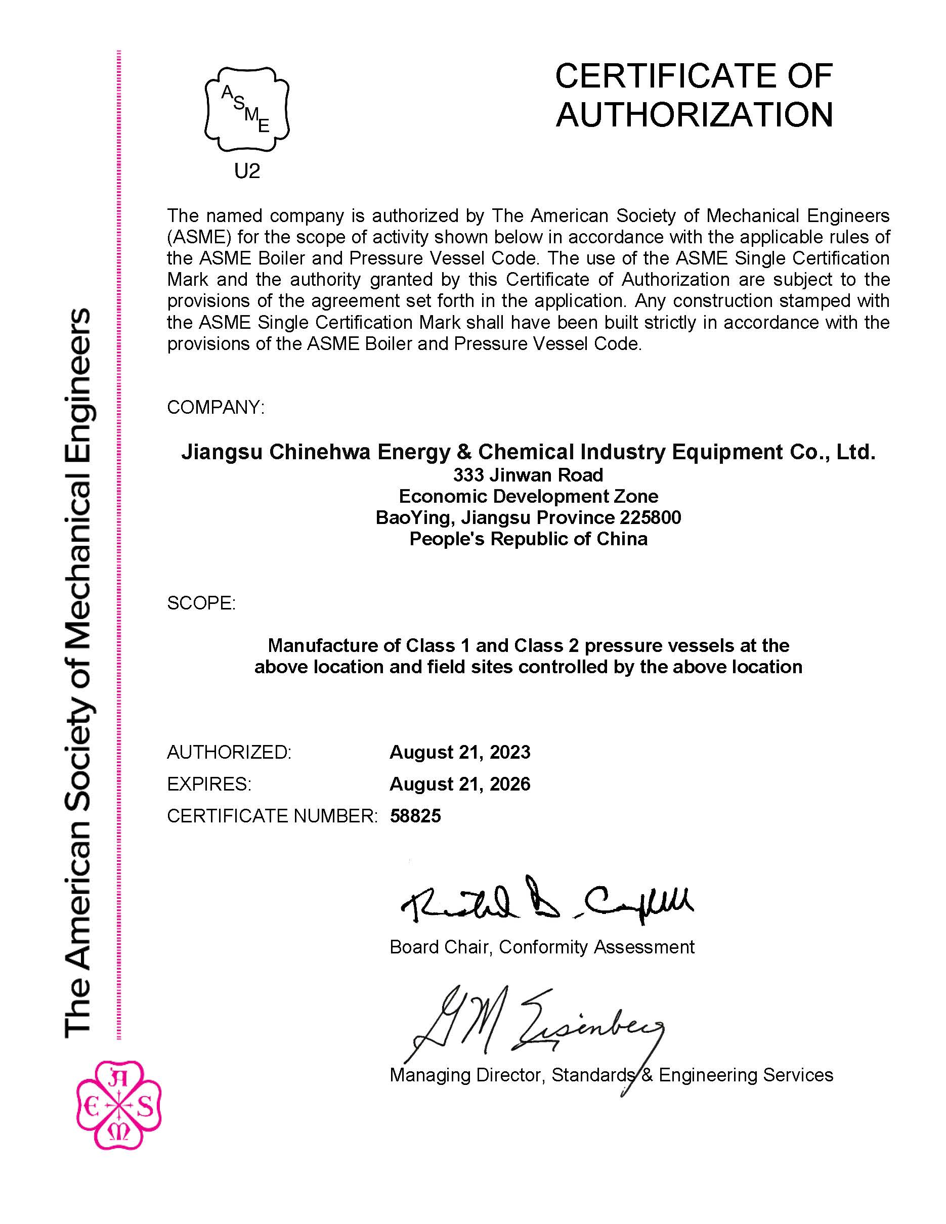 2023年5月18日,ASME聯(lián)檢小組如期到成華公司制造基地-江蘇成華能源化工設(shè)備有限公司進行為期兩天的ASME換證審核,此次審核主要針對U和U2鋼印,審核內(nèi)容包括文件體系審核、設(shè)計人員答辯、車間考察等等。ASME聯(lián)檢小組對于此次的審核很滿意,公司圓滿完成換證,于2023年6月24日獲得U和U2鋼印證書。